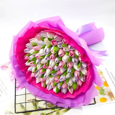 2. Эффект «Вау»: Когда человек получает в подарок огромную охапку цветов, он ожидает аромата роз или лилий, но вместо этого ощущает тонкий ванильно-фруктовый аромат свежайшего лакомства. Зефир ручной работы выглядит настолько реалистично, что отличить его от настоящих тюльпанов можно только при самом близком рассмотрении.