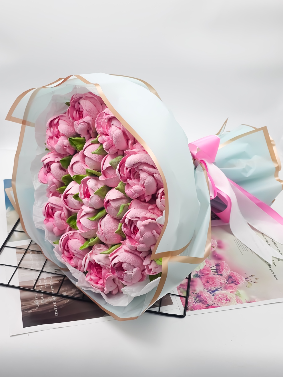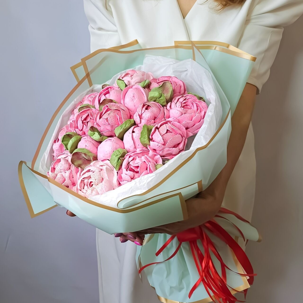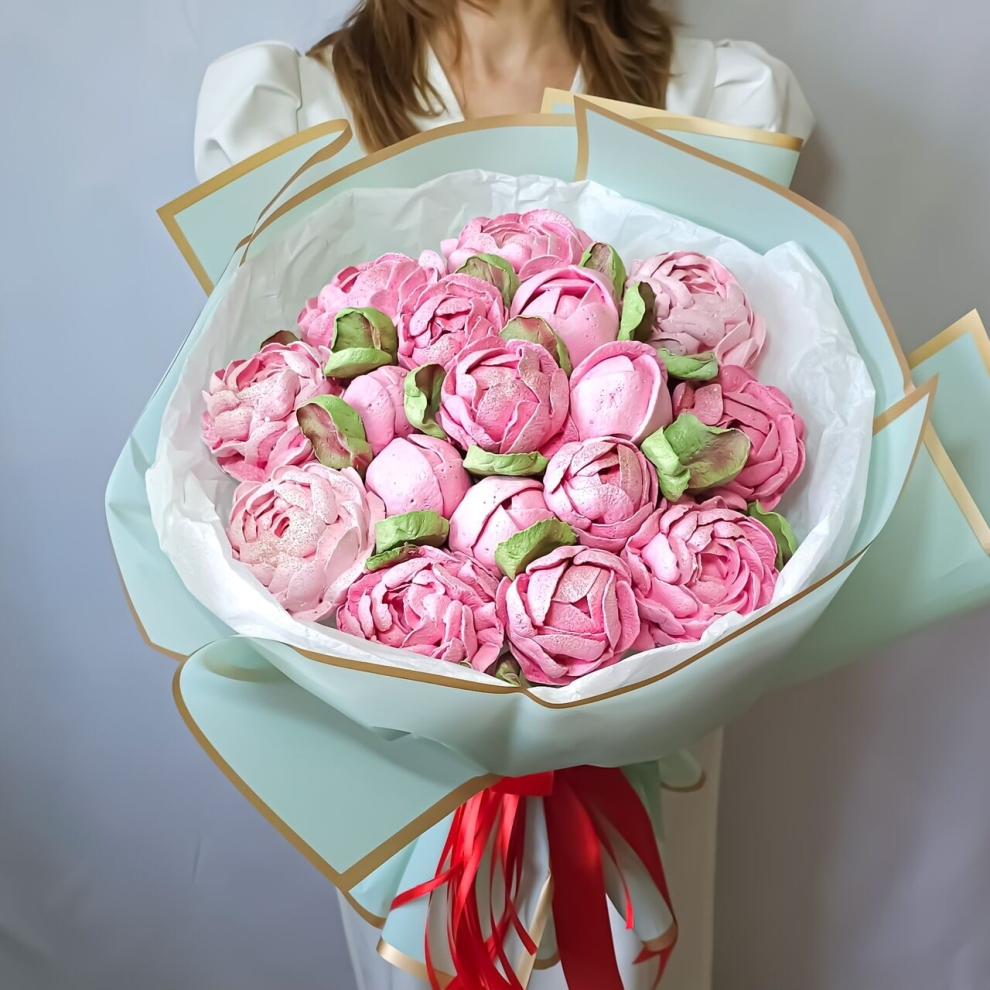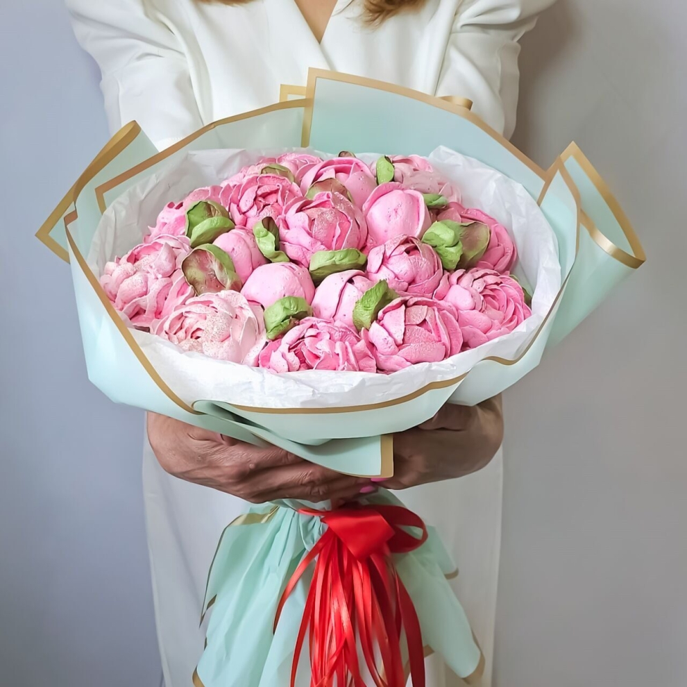Зефирный букет «Сладкое счастье пионов» — это лучшая возможность купить букет из зефира в Москве, который объединяет в себе невероятную реалистичность и изысканный вкус десерта ручной работы. Каждый цветок в этой композиции выполнен вручную, позволяя вам подарить цветы из зефира, в деталях повторяющие пышные розовые пионы с уникальной прорисовкой каждого лепестка. Нежные зеленые листочки гармонично завершают образ, а стильная упаковка в мятных тонах с золотистой окантовкой и яркими атласными лентами превращает этот сладкий букет в полноценное произведение искусства. Решение заказать букет из зефира в нашей мастерской станет идеальным символом вашей заботы, ведь такие авторские зефирные цветы гарантированно вызывают восторг и удивление.