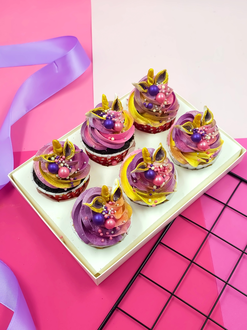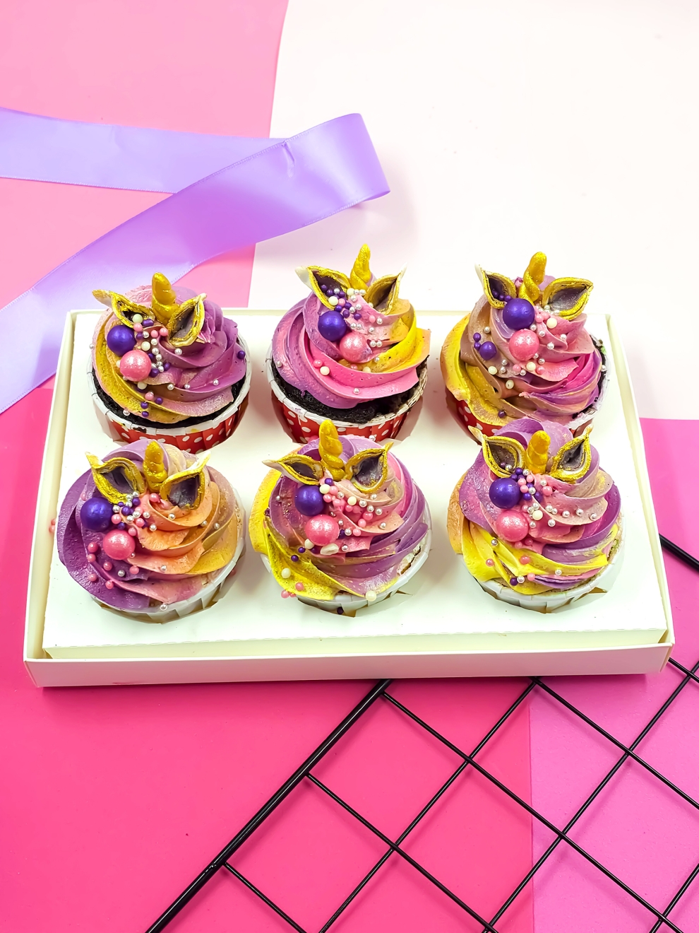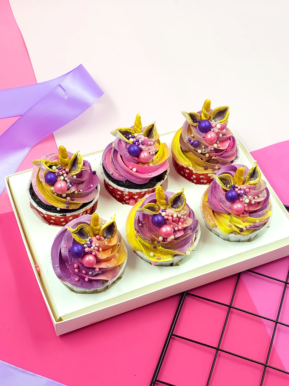 Капкейки с кремом «Сладкий единорог» из 6 штук выглядят, как настоящее чудо. Каждое пирожное украшено жемчужинами и разными сливочными кремами, которые завиваются и образуют мордочку единорога: верхушку каждого капкейка украшают красивые жемчужины, а также завитушки в виде рога и ушек. Филигранная проработка каждой детали, которая отчетливо видна на капкейки фото.