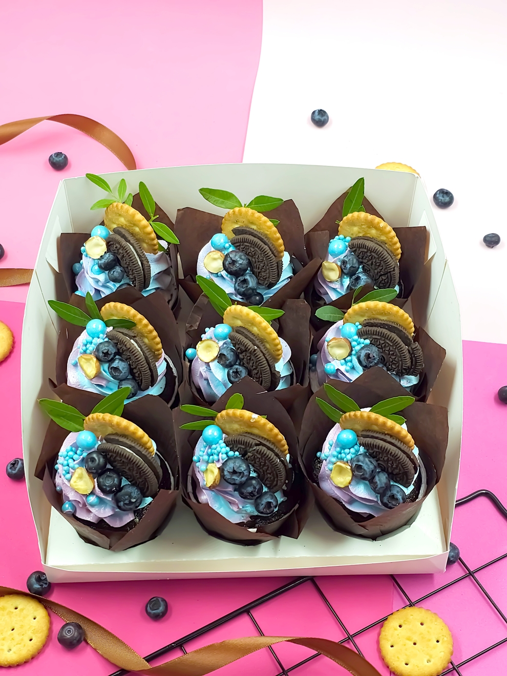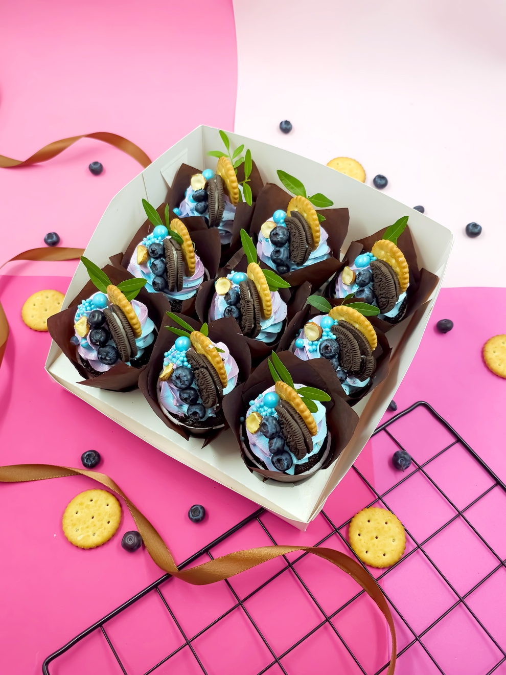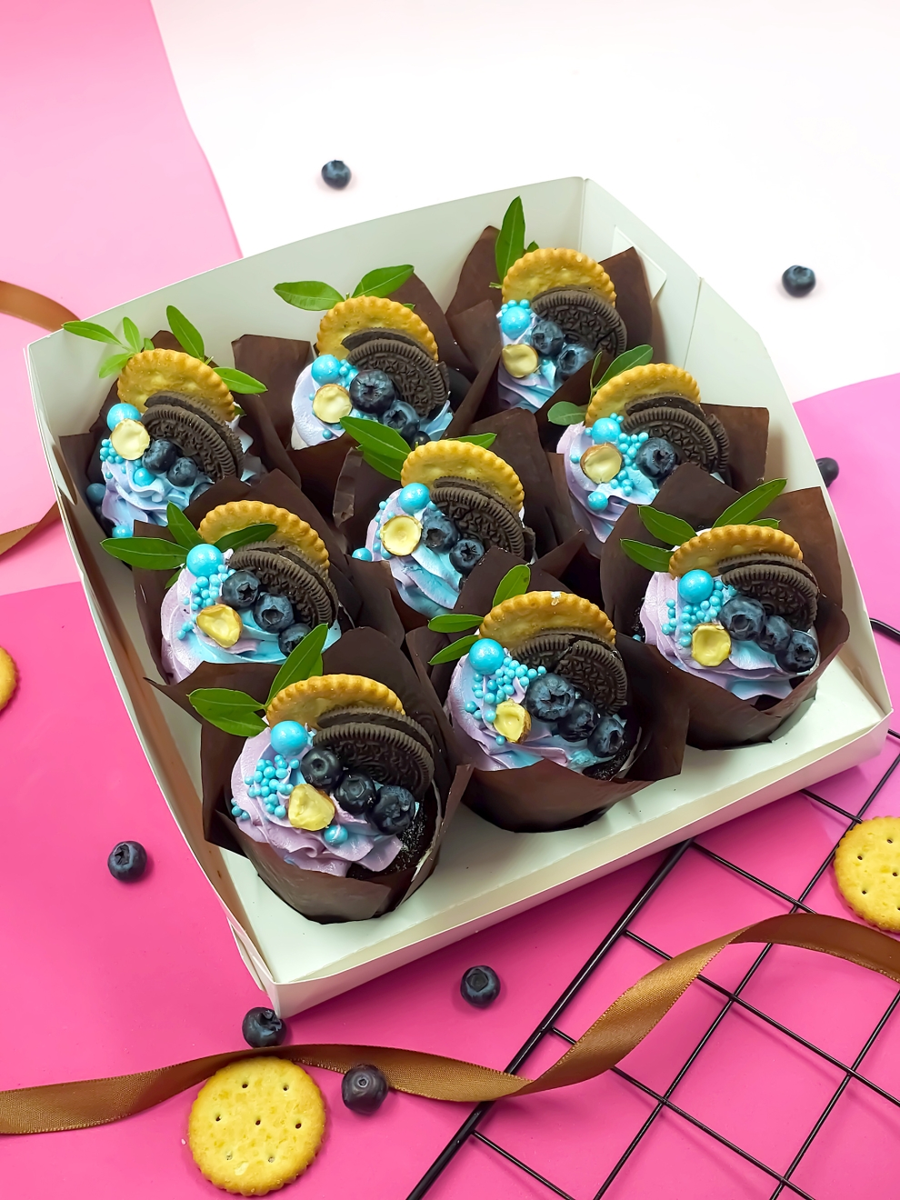 Набор Сладкая девочка — это 9 изысканных капкейков с кремом, созданных для эстетов. Воздушные шоколадные капкейки в темных капсулах-тюльпанах украшены пышными завитками нежного сиренево-голубого крема. Декор каждого пирожного продуман до мелочей: половинка печенья Oreo, хрустящий золотистый крекер, свежие ягоды голубики и половинка фундука.