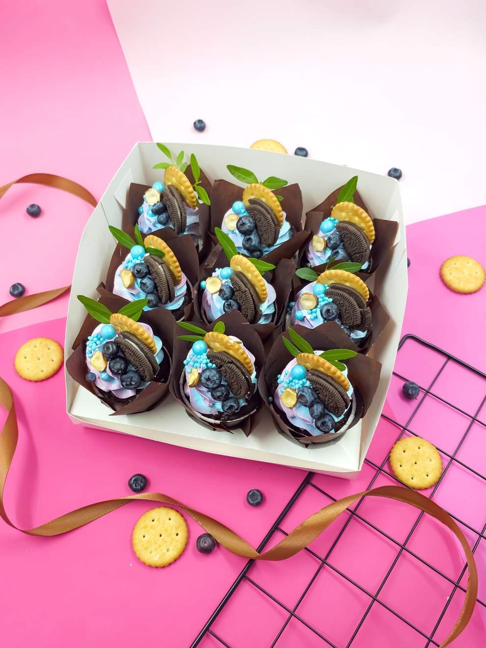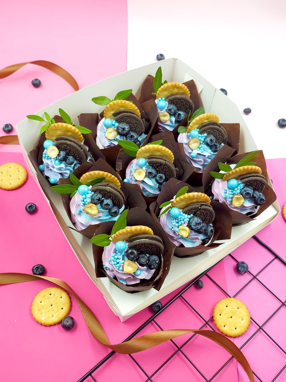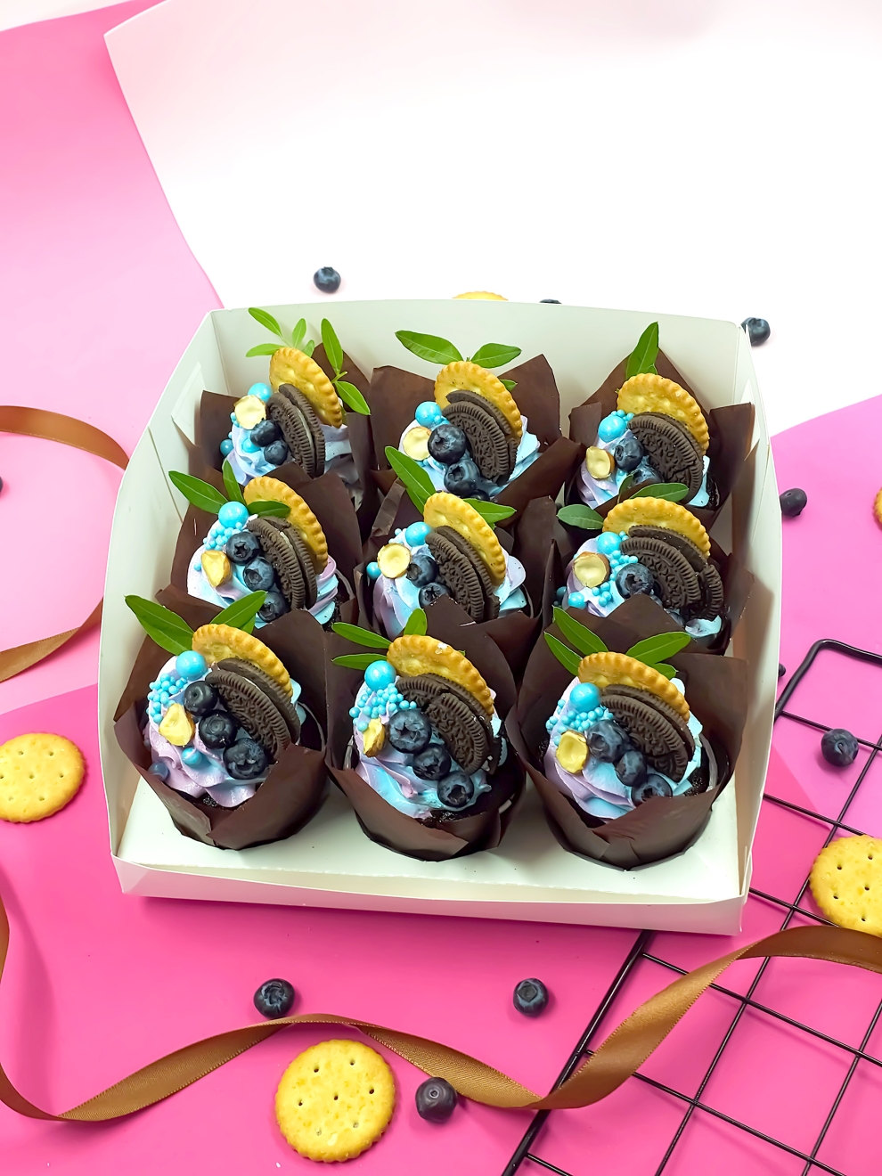 Набор Сладкая девочка — это 9 изысканных капкейков с кремом, созданных для эстетов. Воздушные шоколадные капкейки в темных капсулах-тюльпанах украшены пышными завитками нежного сиренево-голубого крема. Декор каждого пирожного продуман до мелочей: половинка печенья Oreo, хрустящий золотистый крекер, свежие ягоды голубики и половинка фундука.