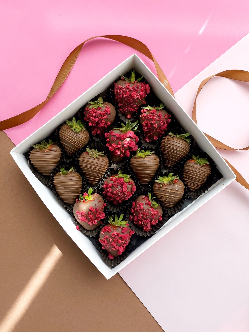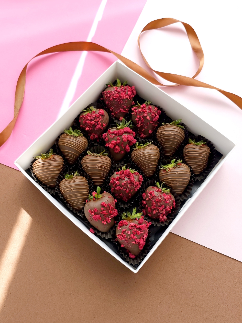 - Клубника, шоколад (Callebaut, Бельгия), сублимированная малина, шоколад (сахар, масло какао, сухое цельное молоко, какао тёртое, эмульгатор: соевый лецитин)