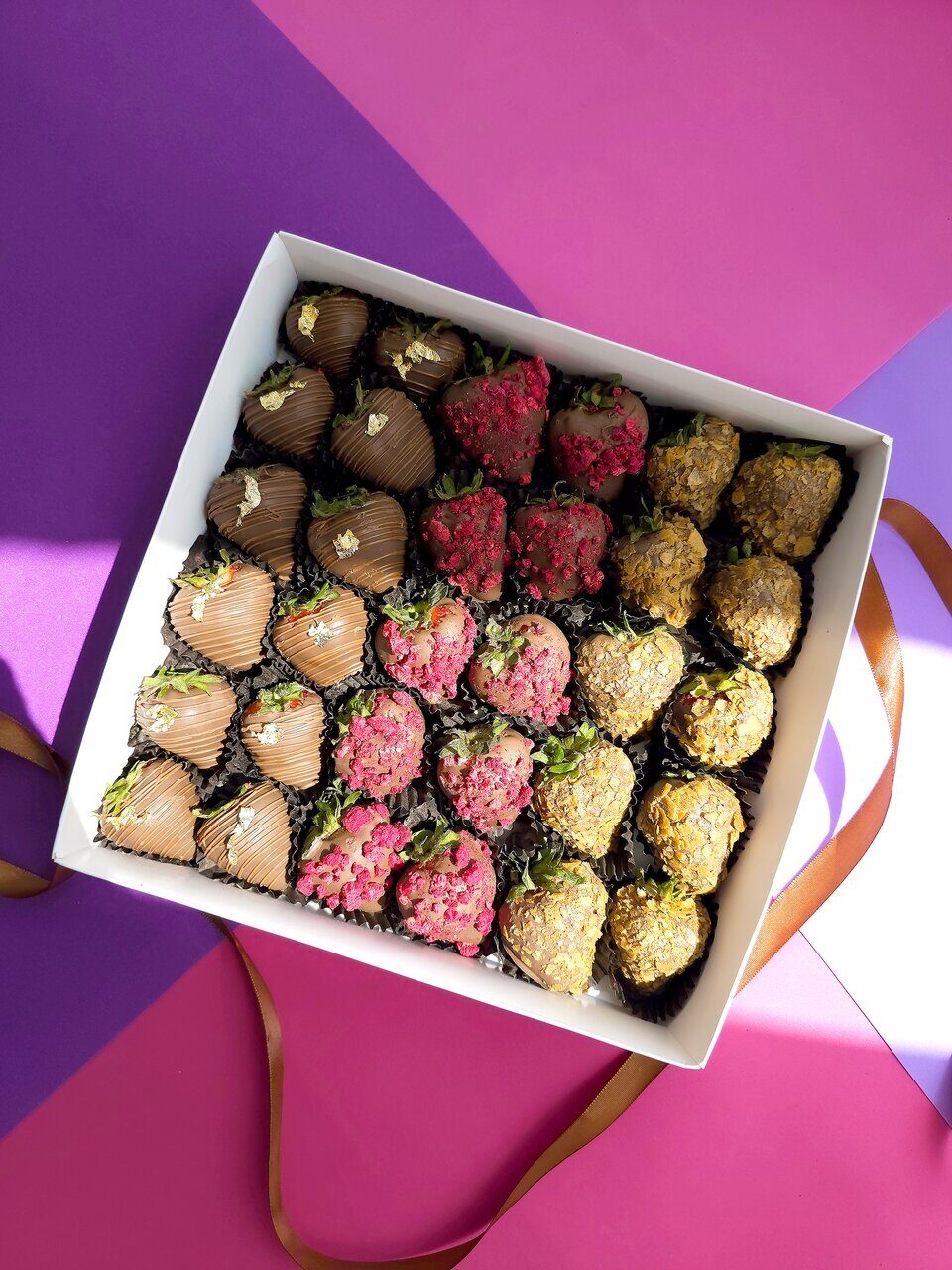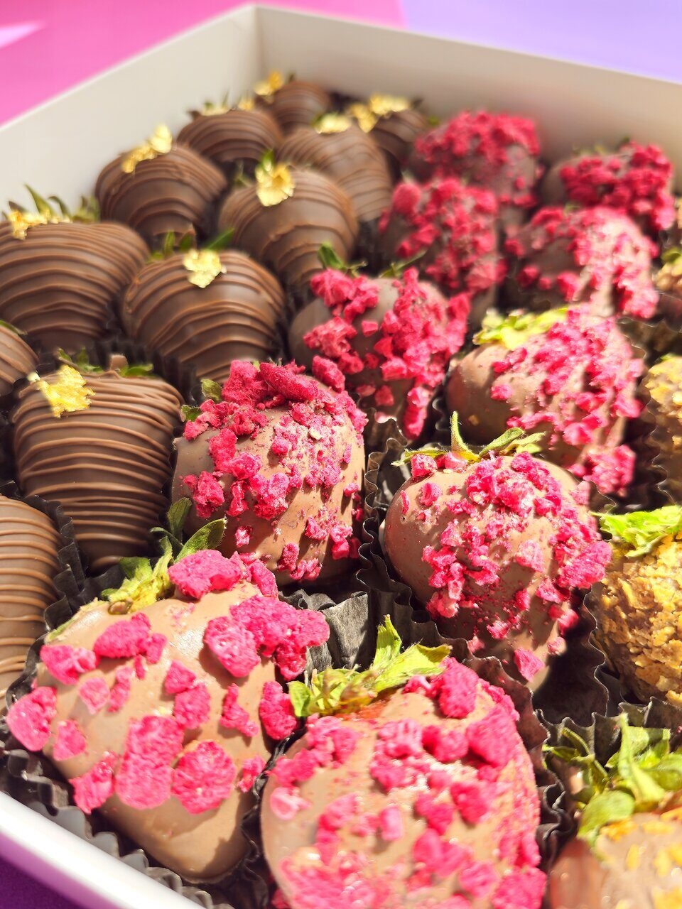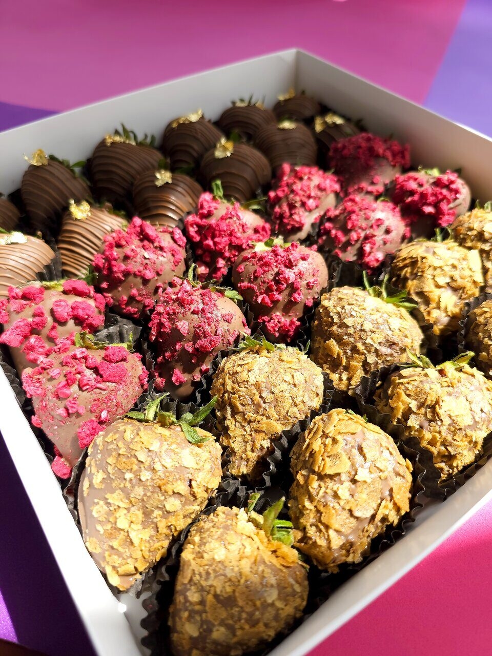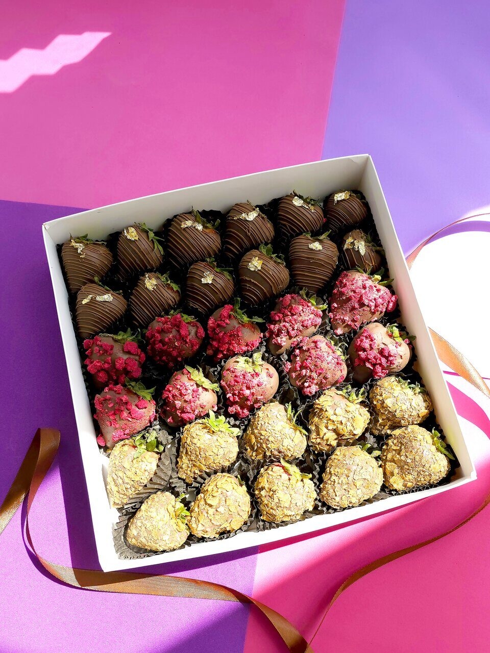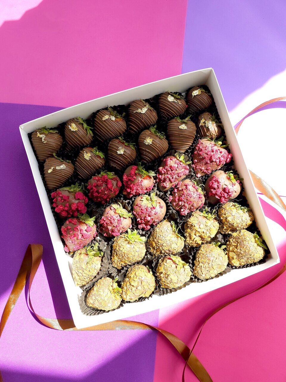 - Клубника, шоколад (Callebaut, Бельгия), сублимированная малина, вафельная стружка, сусальное золото, шоколад (сахар, масло какао, сухое цельное молоко, какао тёртое, эмульгатор: соевый лецитин)
