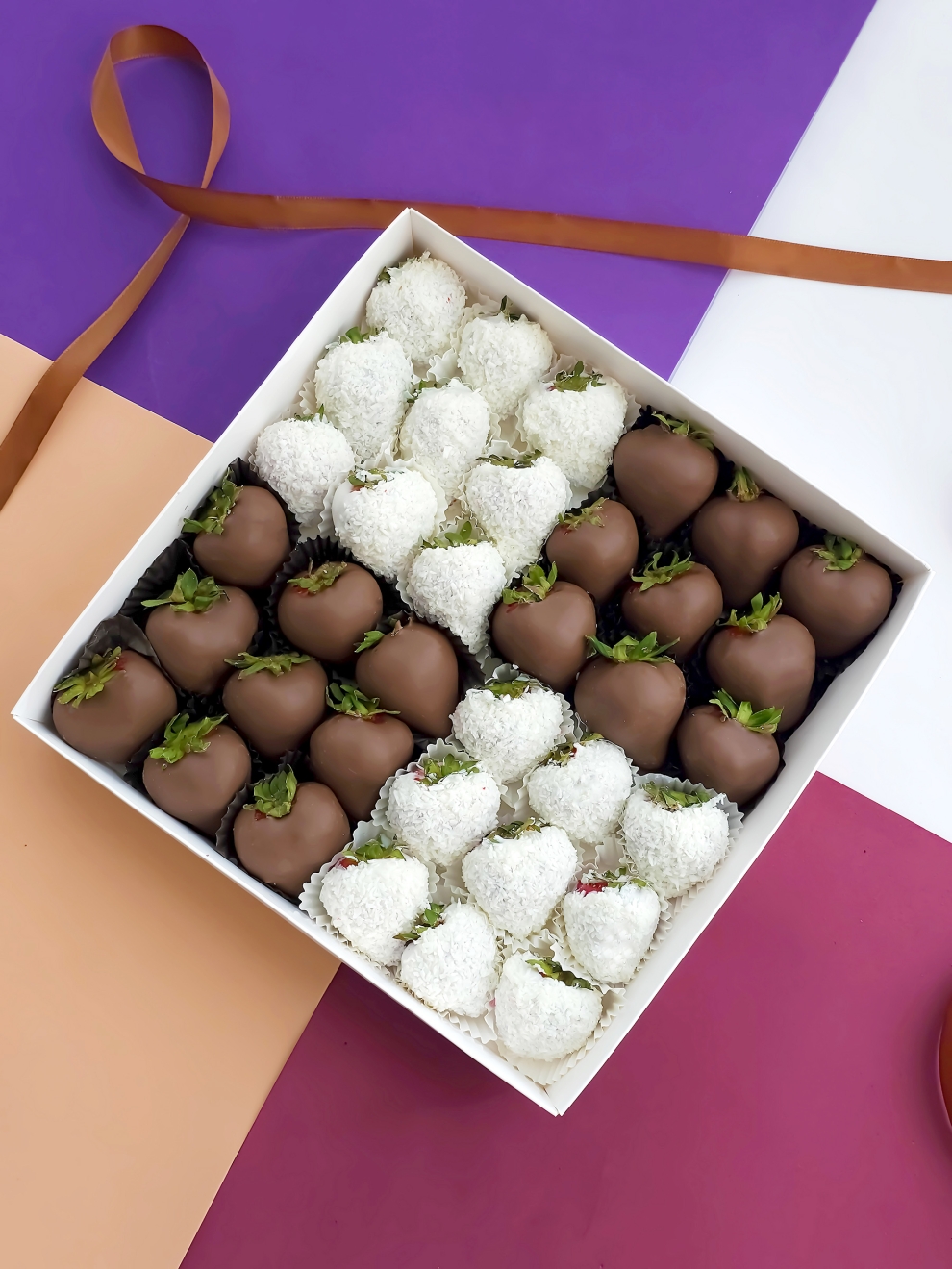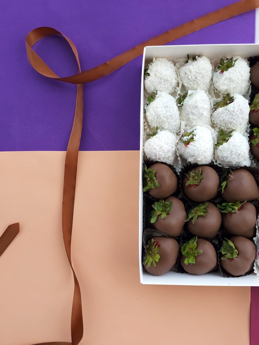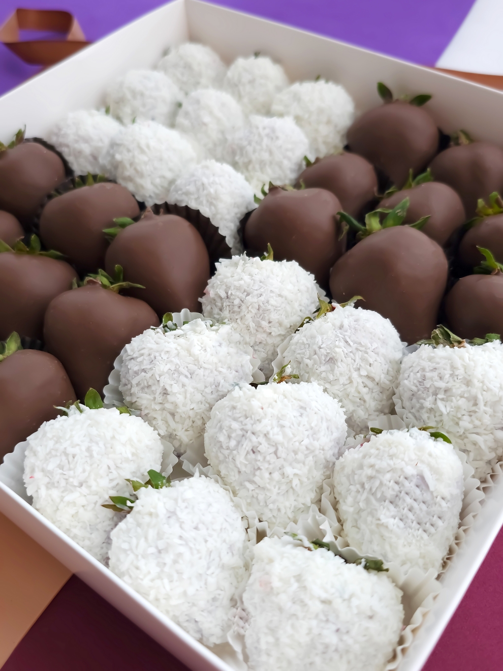 - Клубника, шоколад (Callebaut, Бельгия), кокосовая стружка, шоколад (сахар, масло какао, сухое цельное молоко, какао тёртое, эмульгатор: соевый лецитин)