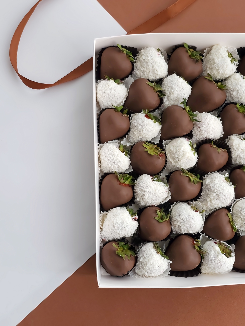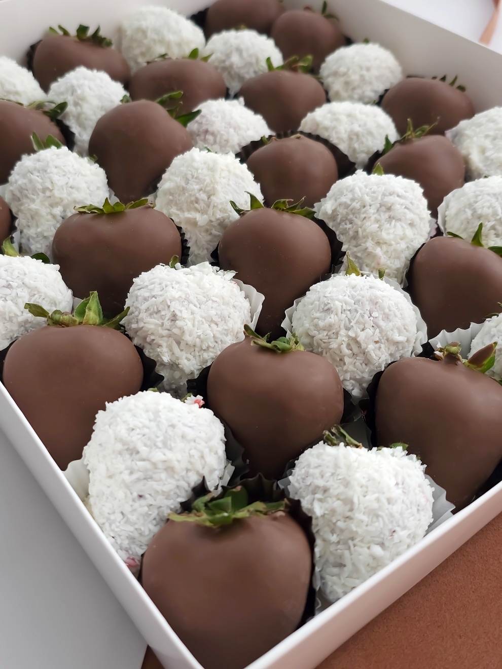 - Клубника, шоколад (Callebaut, Бельгия), кокосовая стружка, шоколад (сахар, масло какао, сухое цельное молоко, какао тёртое, эмульгатор: соевый лецитин)