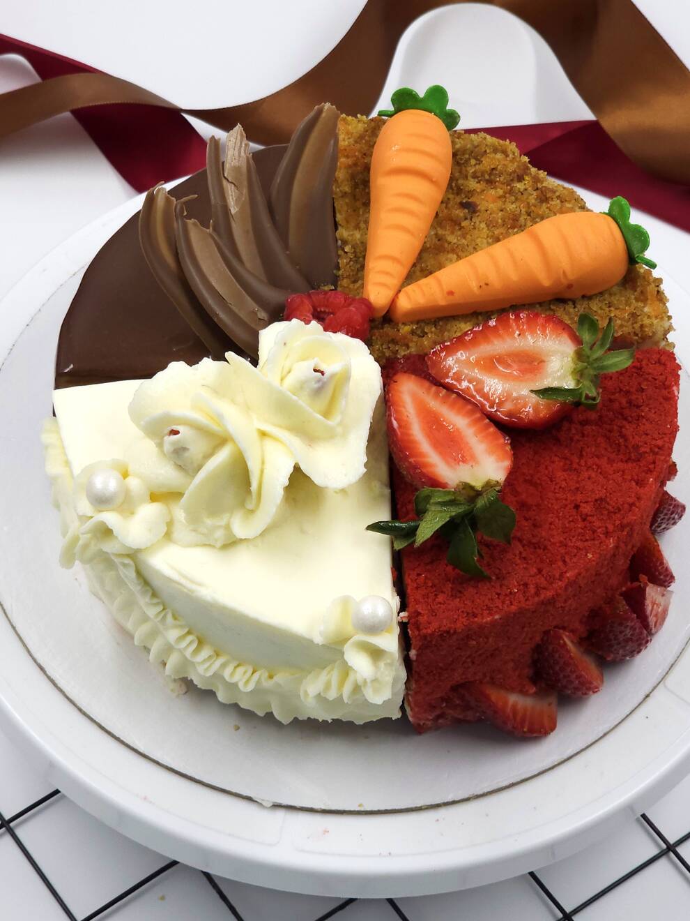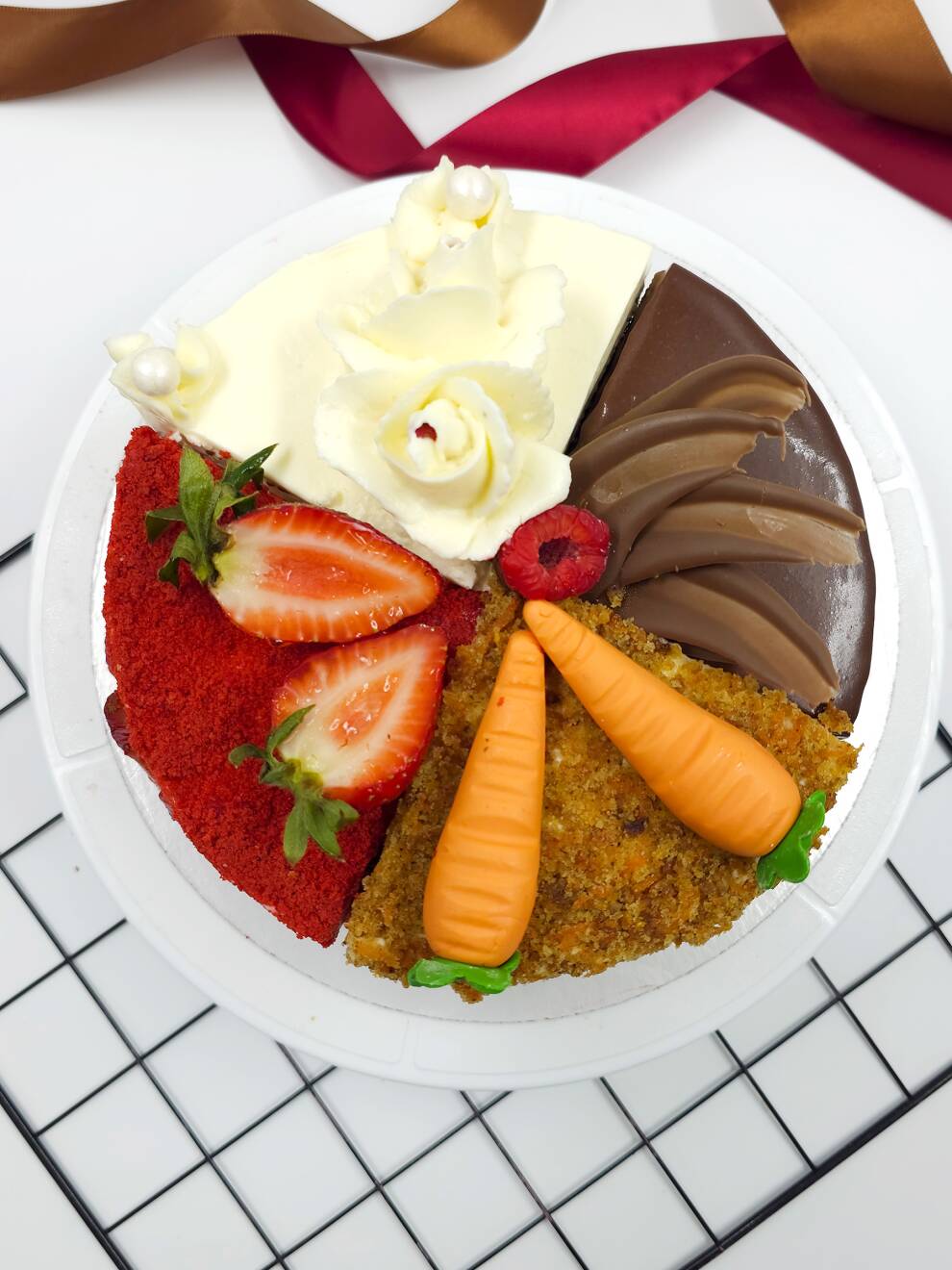 - Морковный бисквит, пшеничная мука, сливочное масло 82,5%, яйцо куриное, сахар, масло растительное, сыр маскарпоне и сливки натуральные 33%, корица, морковь, греческий орех, апельсин , морковь из мастики, Бархатный бисквит, пшеничная мука, сливочное масло 82,5%, яйцо куриное, сахар, йогурт, какао, сыр маскарпоне и сливки натуральные 33%, клубника, ягодное кули , Маковый бисквит, яйцо куриное, сахар, сыр маскарпоне и сливки натуральные 33%, пшеничная мука, молоко, масло растительное, лимонный курд, лимон, черный мак пищевой , Шоколадный Бисквит, пшеничная мука, сливочное масло 82,5%, яйцо куриное, сахар, молоко, какао, шоколадный крем-чиз, абрикосовый конфитюр, шоколаде (Сallebaut Бельгия)