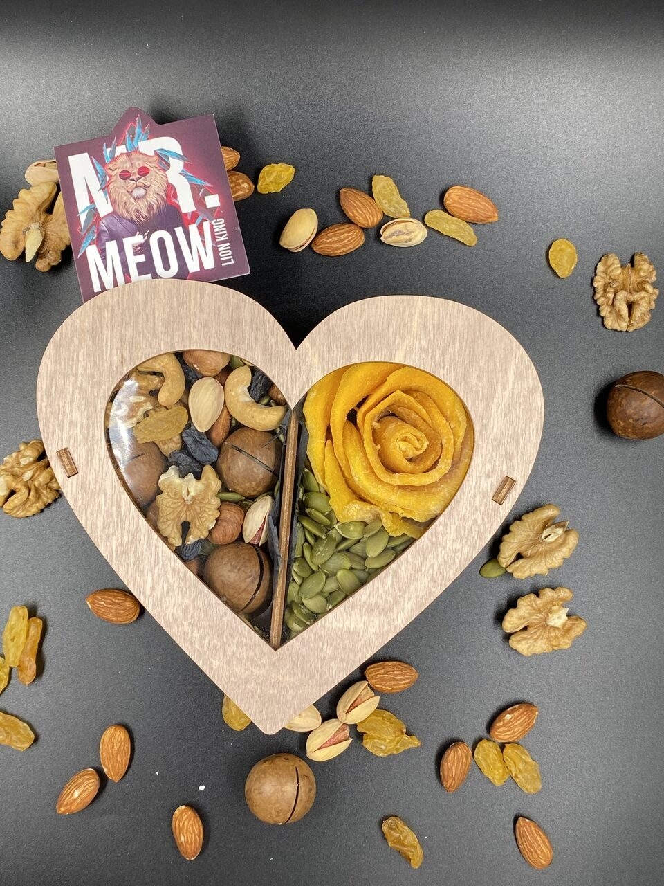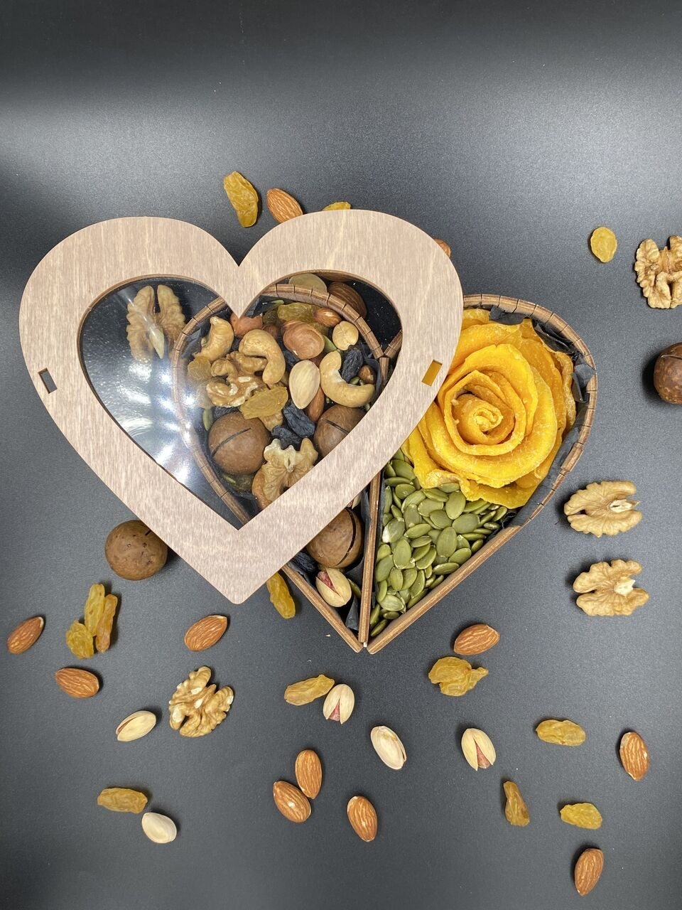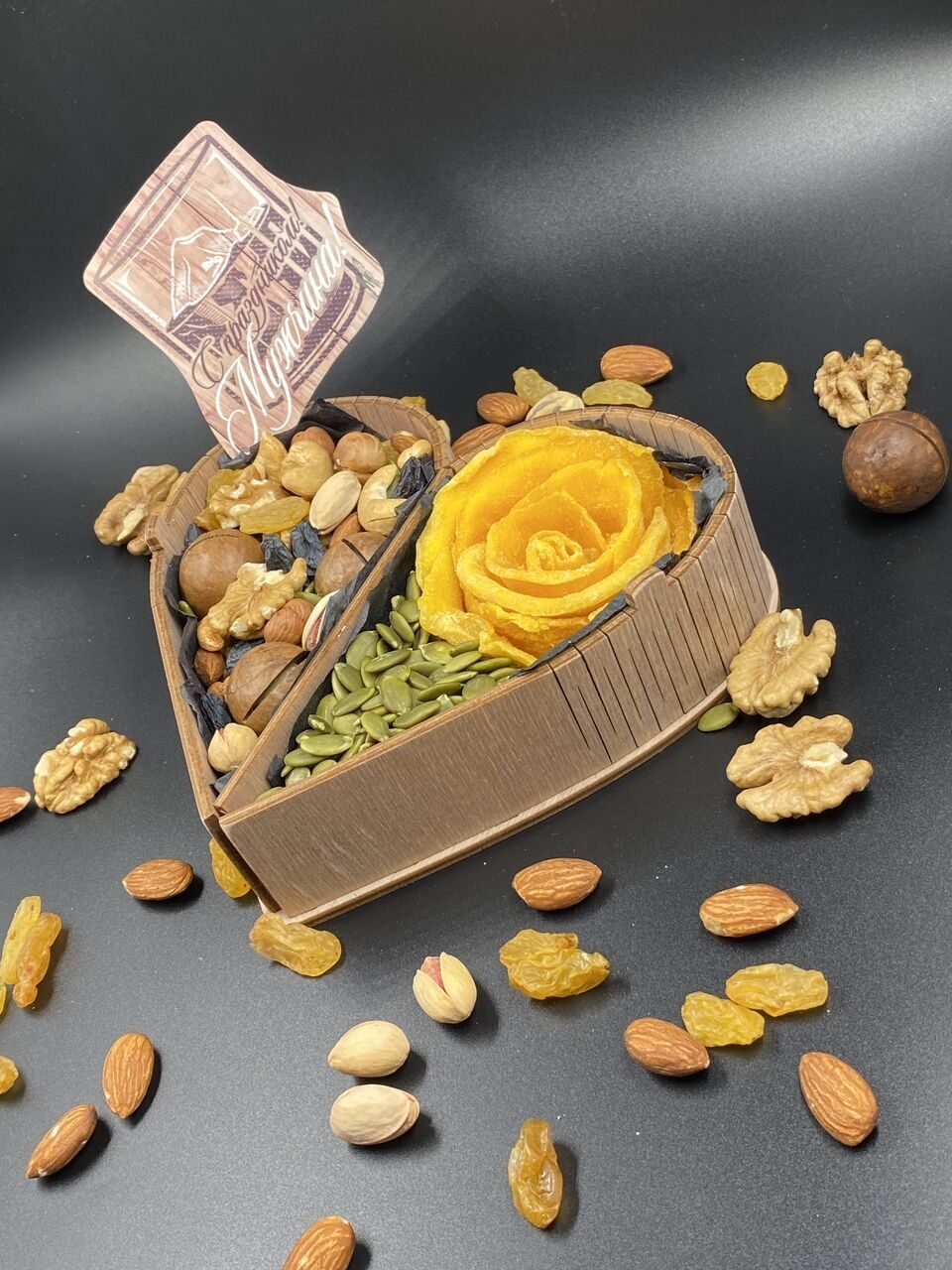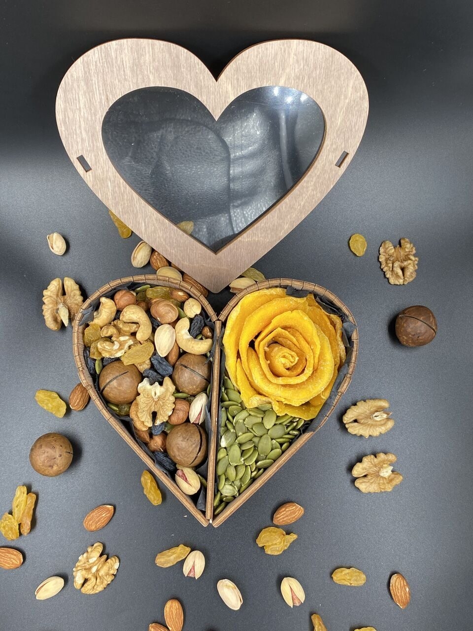 Состав подарочного набора «Сладкое сердце» выглядит невероятно нежно и эстетично благодаря деревянному боксу в форме сердца: одну его половину украшает пышная роза из лепестков натурального манго на подложке из тыквенных семечек, а вторую заполняет богатая смесь из макадамии, грецкого ореха, фундука, кешью и фисташек.