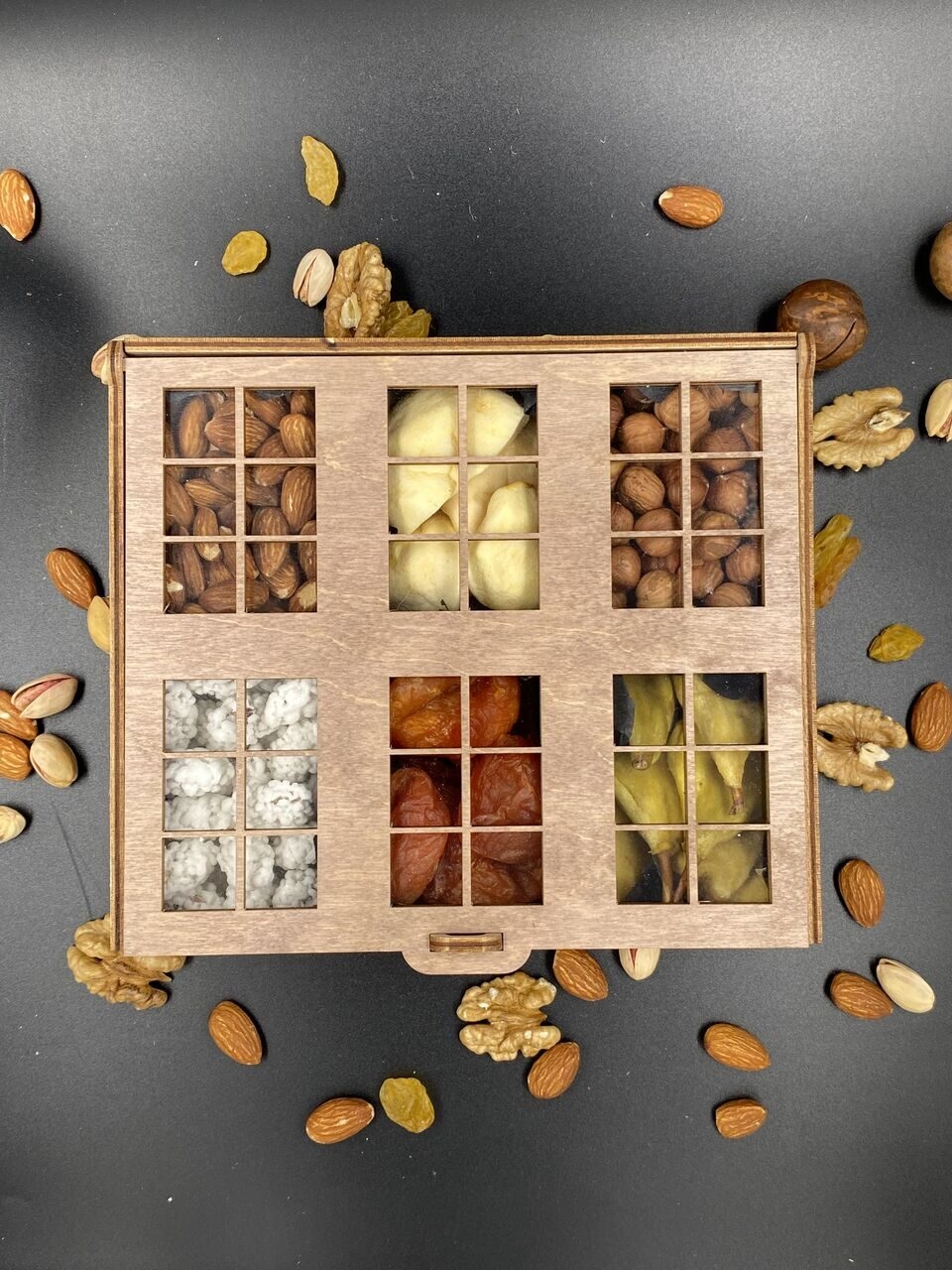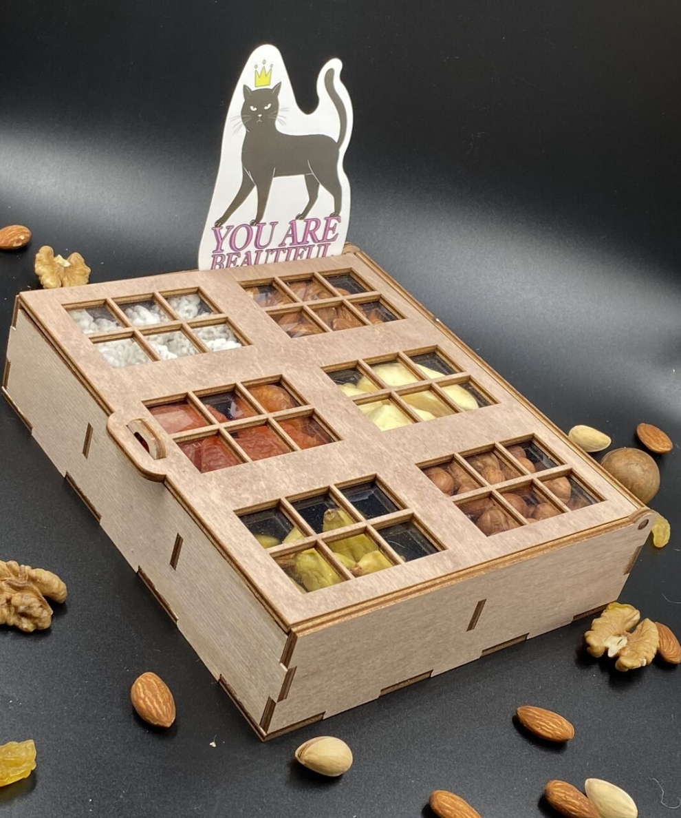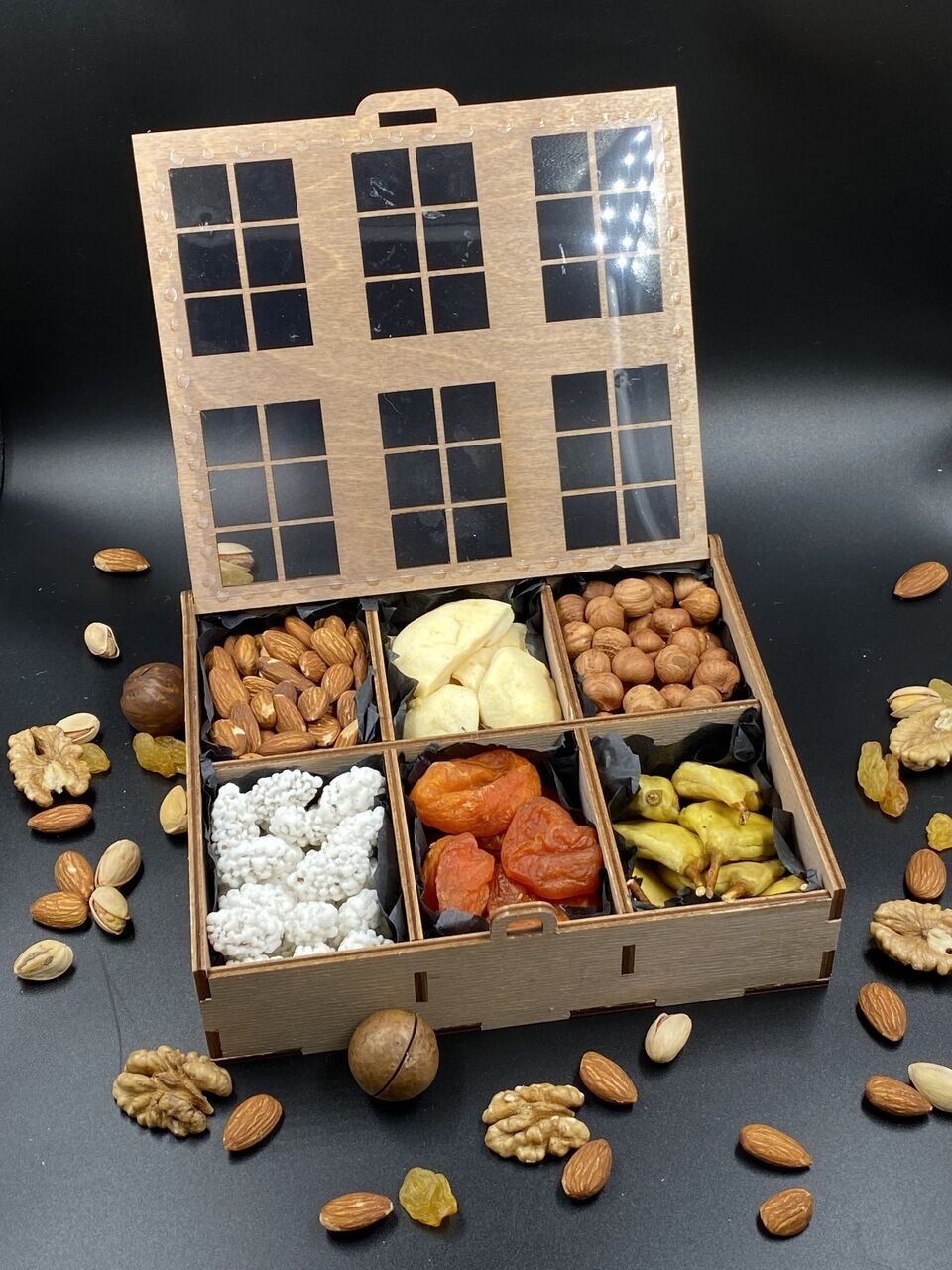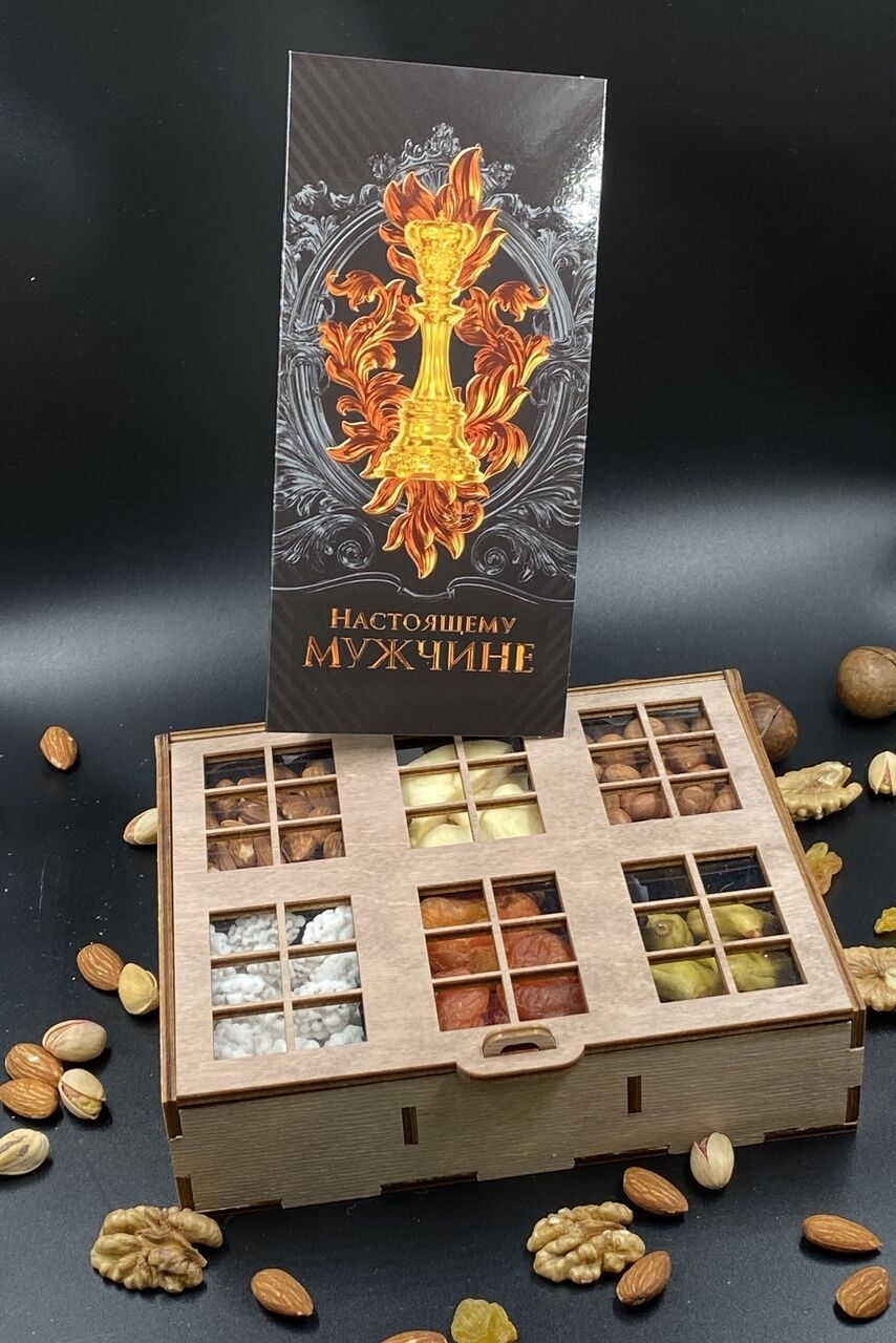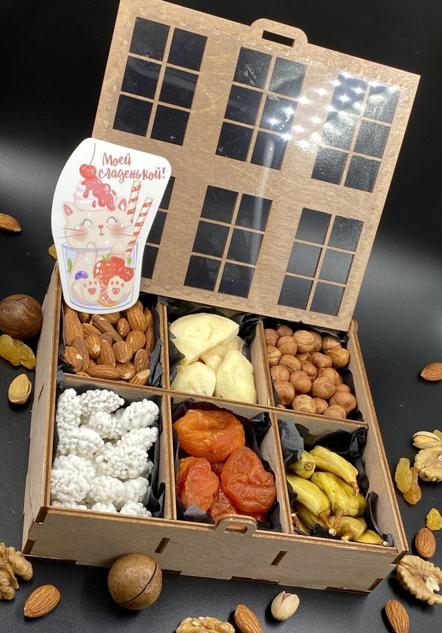 Ингредиенты подарочного бокса «Ореховый домик» гармонично сочетаютс: золотистый миндаль, янтарная курага, цельный фундук и белоснежные сладости. Проработка каждой секции и деревянный короб в виде домика с резными окошками создают чувство уюта и тепла, а оригинальная подача делает этот полезный подарок по-настоящему сказочным.